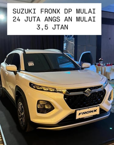 Suzuki Fronx dengan design yg elegant dan bergaya kekinian di lengkapi dengan fitur keselamatan yang sangat lengkap dan sudah hybrid dengan konsumsi bahan bakar yg sangat irit , dengan harga yg sangat terjangkau, di sertai promo diskon dan bonus besar spesial akhir tahun .